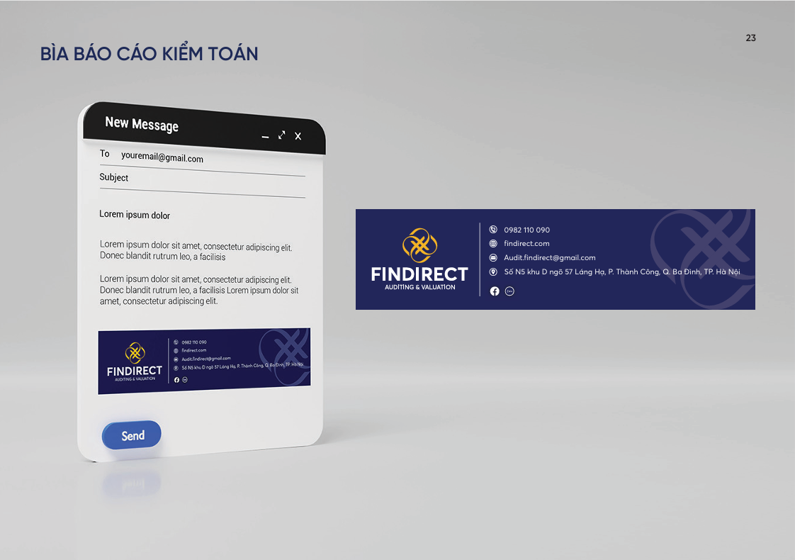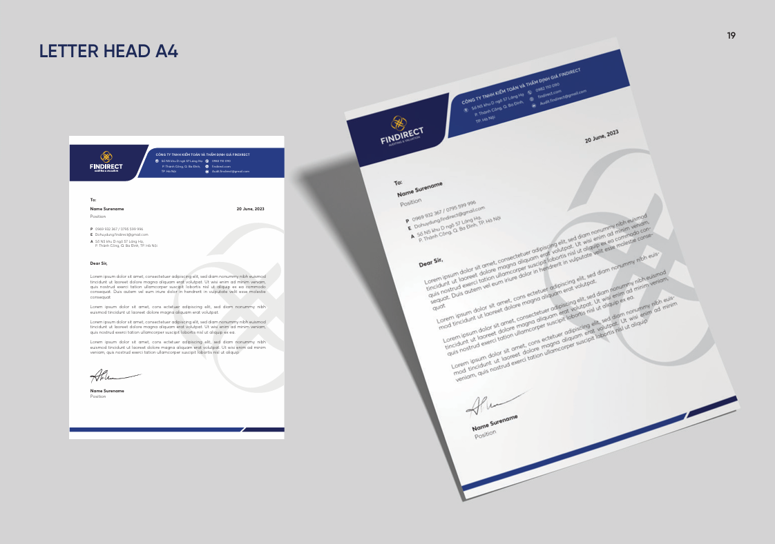 Hệ thống ấn phẩm được chuẩn hoá để sử dụng linh hoạt trong giao tiếp nội bộ và đối ngoại, giúp FinDirect xây dựng hình ảnh thống nhất và đáng tin cậy trong mắt khách hàng, đối tác cũng như các cơ quan chuyên môn. Tính kỷ luật trong bố cục, màu sắc và cấu trúc tạo nên một bộ nhận diện văn phòng hiện đại, đồng bộ và hỗ trợ tốt cho hoạt động vận hành hằng ngày.